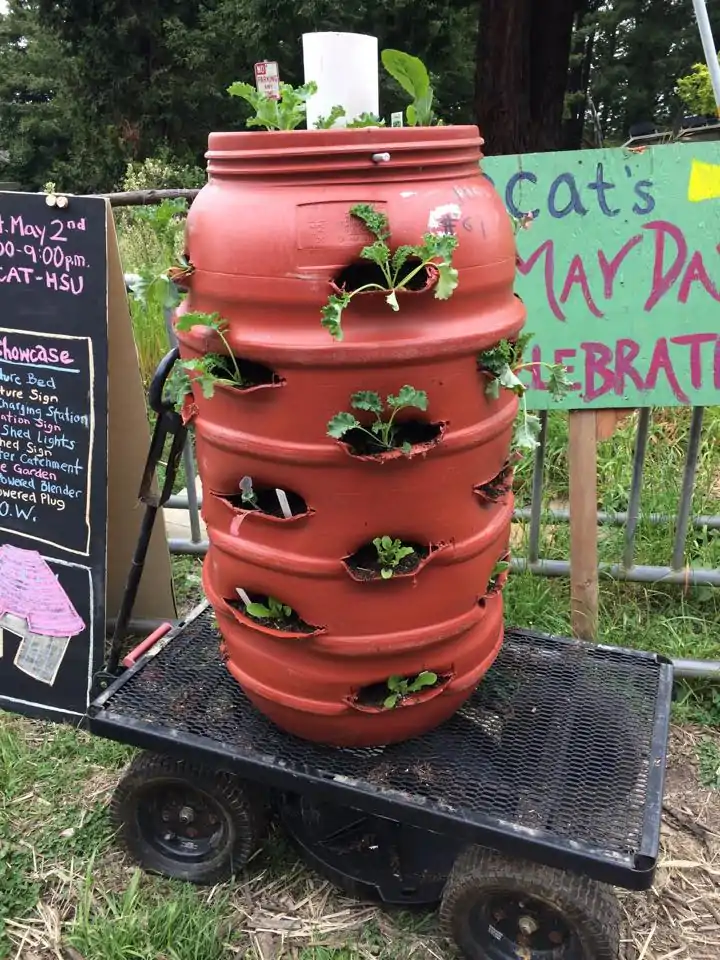 The use of plastic drums is a versatile and cheap way to set a structure for a vertical garden. The plastic manufacturing process is essentially the recovery and recycling of waste polymers, since their natural decomposition process is long and critical to the ecological balance.[2]