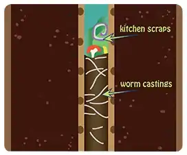 - To start, add 10 inches of kitchen scraps inside the pipe and 5 inches of bedding (shredded paper and/or soil).
