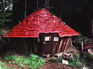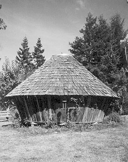 The yurt at CCAT, as pictured above, differs in design from both traditional and imported styles of yurts. The most notable differences are that the walls are made out of plywood board and the roof is covered in wood shingles. Also, on the inside, there is a bench built into the wall that circumscribes the entire floor.