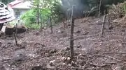 Excavating a large amount of hillside behind the Yurt left us with no real option but to continue with the construction of a retaining wall structure. The decision to erect a vertical, rather than horizontal, log wall was heavily influenced by our available resources in the area. Piles of decent sized logs littered the hillside behind our work site and would be ideal for vertical building. Also, the height and intensity of the wall made it unrealistic to consider contour wattling.