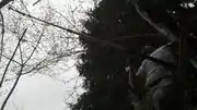 Harvesting our live alder stakes was done concurrently with the fern relocation. A large aluminum ladder was secured to an alder by a piece of rope. A large extendable tree pruner (12 ft. reach) was used for the cutting of the branches. In addition to its cutting tip, our tree pruner has a large saw blade at the tip. This blade was covered up with newspaper and taped up to prevent any injury. The cutting phase was extremely dangerous, and a lot of care was taken to prevent injury. The felled branches were taken to a processing area where they were stripped of their offshoots, and cut down to size with a table saw. Each felled branch yielded 2 - 3 finished stakes and plenty of smaller branches and offshoots. A 44 gallon trash can was filled with water and used to soak about 60 stakes, pointy tip down. All smaller branches, offshoots, and other alder leftovers were set aside and treated with water every other day until used for branch packing.