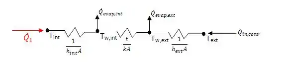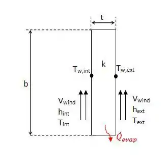 As shown in the figure, there is convection over the surface, as well as evaporative heat loss from within the wall. It was assumed that the evaporation only occurs on the inside and outside surfaces of the wall, and that it could be modeled using equation 5, the correlation for free surface evaporation.