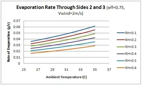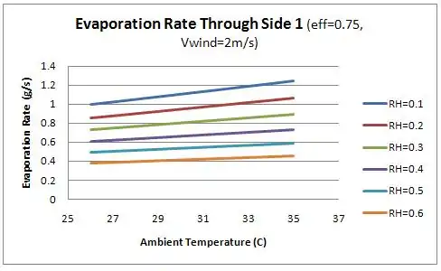 As evident from the figure, for heat to be removed from the inside of the device, the sum of the evaporative heat removed must be greater than the heat added from convection. The conduction coefficient for charcoal was assumed to be the same as wood, approximately 0.16W/mK[9].