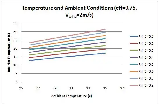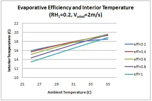 For previous figures, the evaporative efficiency was assumed to be 0.75. It should be possible to achieve a value of 0.6-0.9 with charcoal[3]. Figure 8 shows the effect of evaporative efficiency on interior temperature.