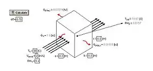 The front side of the cooler can be modeled as air flow through a moist pad. Figure 2, above, is therefore a schematic for the air flow through the front of the cooler. The equations listed in Evaporation through a Transfer Medium apply. The heat transfer [math]\dot{Q_1}[/math] is equal to the rate of evaporation times the enthalpy of vaporization. The temperature internal to the cooler Tint is calculated based on the evaporative efficiency and ambient conditions, as given by equation 6. This temperature is assumed to be constant over the width (b) of the cooler. The internal temperature is therefore dependent on the ambient conditions and evaporative efficiency.