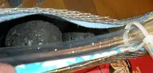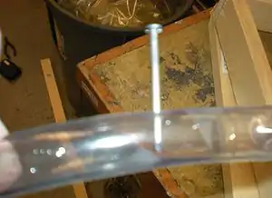 - Tie the end of the hose. Pour some water into the hose to ensure the tie is sufficient to block the end of the hose. If tie is not sufficient, a stopper must be used to prevent water from flowing through the hose. If hose is unavailable and tins are used, the tins can be fastened to the top of the frame, with holes poked by nails on the charcoal cavities. If this method is used it is recommended that the tins have lids to prevent evaporation of the water from the surface of the tins.