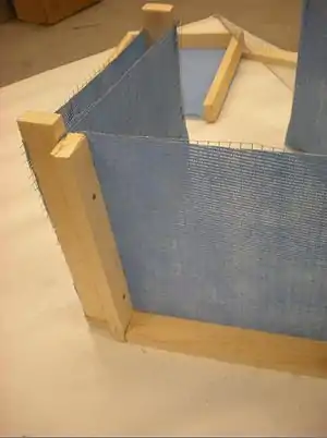 Apply to ALL framesFasten the chicken wire on top of the jute cloth of each frame. Fastening nails can be used, but must be bent over the wire mesh to hold it in place. Care should be taken when handling the mesh wire as edges are sharp.