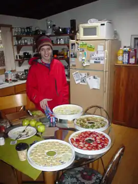 If you Go Solar... One thing I didn't mention already that should be considered should anyone be looking to build their own solar food dehydrator after looking at this page, is how messy it can be, or rather, what kind of mess the food you're dehydrating can leave in your dehydrator. If you haven't dehydrated food before, you might not know this. The point here is that whatever gets dirty, you need to be able to clean. Removable/Reusable or Single-use components should be part of the system (i.e. Single-use cheescloth and plate, or removable wire rack and tray).
