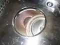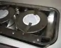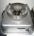The stove is designed around the innovative ethanol canister, which is patented in the EU. The cylindrical, stainless steel canister is packed with a special refractory mineral fibre which adsorbs up to 1.2 litres of ethanol on its surfaces. When the stove is lit, the ethanol evaporates and mixes with air to burn readily, allowing a maximum power of 1.5 kW per burner. Provided that the canister is not over-filled, the ethanol will not leak or spill even if the canister is knocked over. The canister does not need to be pressurised, which minimises risk of explosion. The canister is approximately 240 mm diameter and 50 mm tall, and filled via a 80 mm diameter hole in the top, which is covered by a metal mesh to prevent the fibre from coming out.