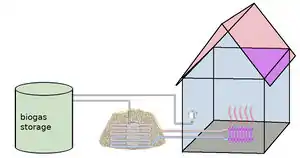 The compost heater (also Biomeiler) it a setup for utilization of the heat dissipation of a composting process. The thermal effect is well known from a compost heap, where the biomass is decayed by the digestion and metabolism of many different microbes and invertebrates. The heat is used, for instance, for a dwelling house.