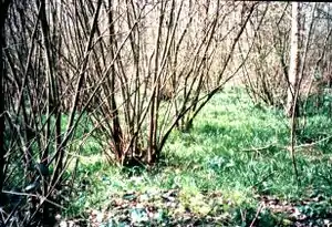 Coppicing is a traditional method of woodland management, by which young tree stems are cut down to a low level, or sometimes right down to the ground. In subsequent growth years, many new shoots or "suckers" will grow up, and after a number of years the cycle begins again and the coppiced tree or stool is ready to be harvested again. Typically a coppice woodland is harvested in sections, on a rotation. In this way each year a crop is available. This also has the side-effect of providing a rich variety of habitats, as the woodland always has a range of different aged stools growing in it. This is beneficial for biodiversity.