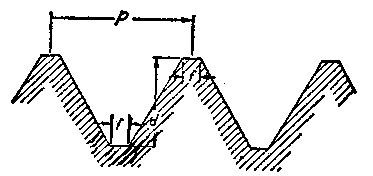While screw-threads will vary, the American Standard is the one most frequently used in this country (USA) for all general work. The form of the thread is a triangle with an angle of 60 degrees between the sides. The top and bottom are flattened to a width of one-eighth the pitch; the depth is .649519 of the pitch. The pitch or rise of any thread is the distance the nut travels in one complete revolution. The American Standard Thread is shown in Fig. 1.