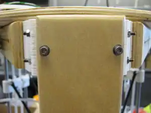 - The controller is mounted so that it stands off the vertical board with a series of nuts and washers on M3 x 25mm screws serving as anchors and standoffs. The order of items on the screws, starting from the interior of the printer, is washer-vertical board-washer-nut-nut-washer-controller-washer-nut. When complete, the controller should stand off the vertical board about 1cm and the last nut should be flush with the end of the screw.