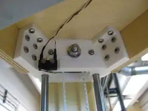 - If the vertical boards have no mounting holes drilled in them, first mark the location of the holes by standing a vertical board against an apex centered over the exposed idler end. Push a 3mm drill bit into the vertical board mounting holes in the idler end from the interior of the printer, forming an indentation in the vertical board.