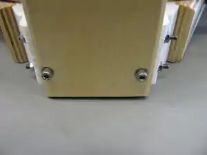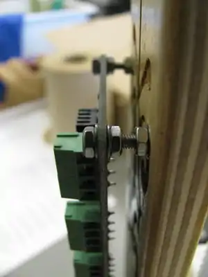 - Prepare 4 M3 x 25mm screws with washers. Pass the screws through the controller mounting holes in the vertical board so that the screw head is on the interior of the printer. Put washers on the exposed ends of the screws on the exterior of the printer and then start nuts on each screw, but don't tighten them. Put the controller on the screws to ensure that they are properly aligned and tighten the nuts so the screws are firmly affixed to the vertical board.
