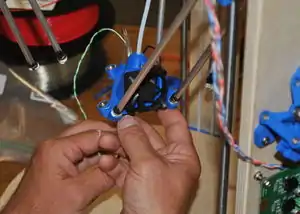 Tie rods engaging magnets in carriages. - Engage the magnets in the end effector with the opposite end of the tie rods. Have the fan facing the controller board.