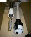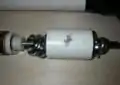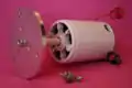 Bottom: the bearing assembly and generator. Top: bearing sleeve and generator case. The bottom assembly goes inside the top asssembly.