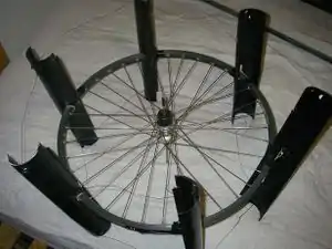 A problem with this particular style of turbine is that it does not self-start in the wind. Some people have tried incorporating savonius or other drag systems into their design to solve this problem. The difficulty with having a drag turbine inside a lift turbine is that it may slow the whole thing down. After thinking about this for a while, I came to the conclusion that if the drag system was attached by a unidirectional axis, or a ratcheting device, it could start the system without slowing it down. So, using a bike wheel and some PVC half-rounds I constructed just such a device to be mounted at the top of my lift turbine. At the last minute I threw this together using duct tape, but it does function.