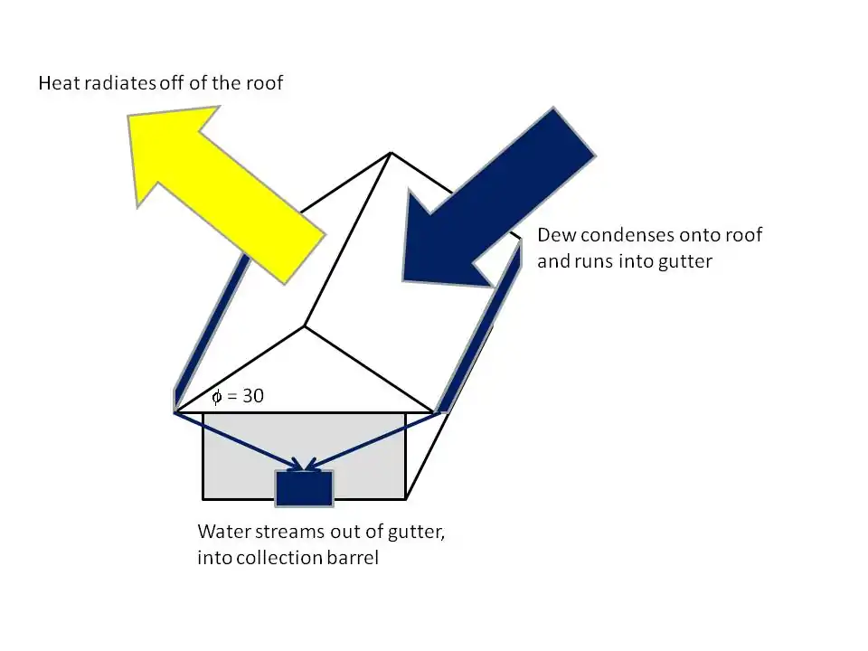 There are design features such as thermally insulating the roof, or building with a hyper-radiative material, would add to the dew yield. However, these things would be too costly to be economical. Instead, what is considered is an appropriate retrofit for a roof to install a dew collection system. It should be able to provide 2L per dew night from an average family sized roof.