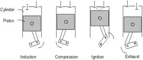 The combustion process in the petrol engine and the diesel engine differ in the following ways. In the petrol engine the petrol and air mixture is drawn into the cylinder, compressed (compression ratio ranging from 4:1 to 10:1), and ignited by a spark introduced by an electrical system. In the diesel engine, air alone is drawn into the cylinder and is compressed to a much higher ratio (14:1 to 25:1) than in the petrol engine. As a result of this compression the air is heated to a temperature of 700 – 900 oC. Only then is a certain quantity of diesel fuel injected in to the cylinder and the fuel ignites because of the high temperature. Hence the petrol engine is often referred to as the spark ignition (SI) engine and the diesel as the compression ignition (CI) engine. Secondly, there is the sub-division according to cycle type; the two stroke or four stroke cycle. This means that engines have an ignition phase on every revolution of the crankshaft or every other revolution. The method for mixing and injecting air and fuel is different for the two cycle types. Most IC engines use the four stroke cycle.