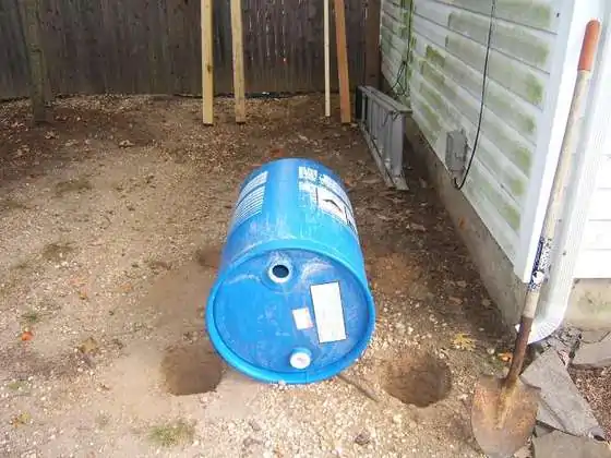 To begin, I laid out a 55 gallon drum on the ground and dug a hole on either side in the spot that the poles (4x4 pressure treated lumber posts) were going to go.