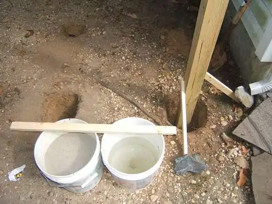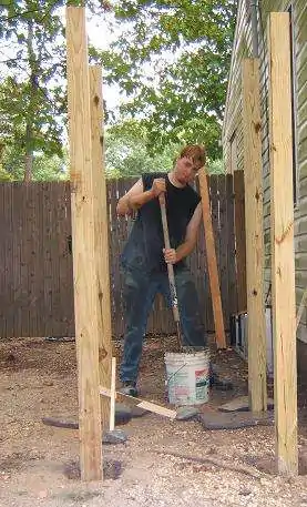 With the first post in the ground, I leveled it off with a level and propped it into place with scrap wood. Then, I began to mix the concrete. This entire project took three 50lb. bags of fast-drying concrete. With the concrete mixed to the right consistency, I poured it around the base of the post.