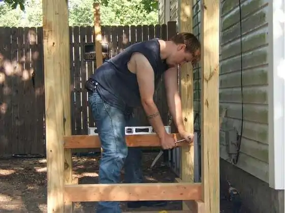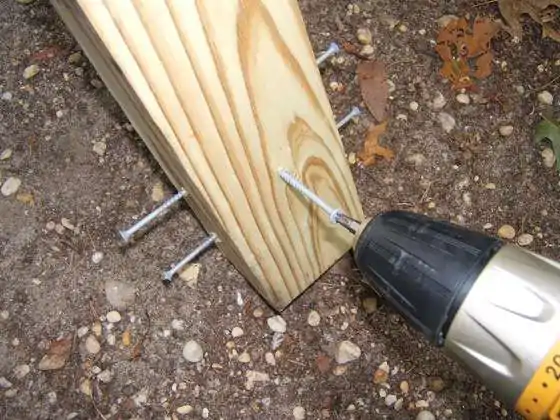 I drilled pilot holes into the posts where the barrel brace was to go. The pilot holes were exactly 13 inches up from the ground.
