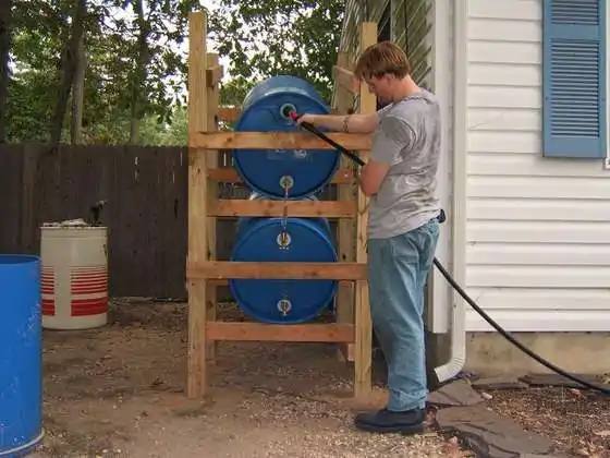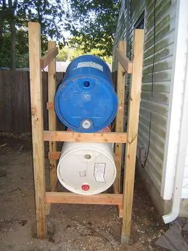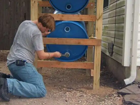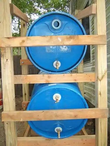 - The bottom barrel would most likely benefit from a small hole drilled above the water line to let out air as it gets replaced with water. This will allow the top barrel to drain into the bottom barrel faster and at a more steady rate.