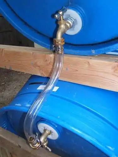 With both hose bibs in the fully open position, water will be able to drain from the top barrel into the bottom.