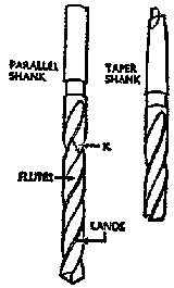 The twist drills used for drilling through metal are much the same as those used for woodwork. These drills range in size from .0135 inch upward. On larger drills it is customary to use high-speed steel, with a shank of tough steel butt-welded to it. Small drills (up to1/2 inch) are usually made with parallel shanks, while larger drills are more frequently designed with a tapered shank.