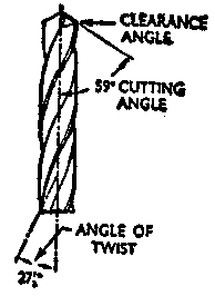 The flutes are made to ensure the correct cutting angle and at the same time give sufficient clearance for the waste material to flow out of the hole. This angle (Fig. 2) is called the angle of twist and is usually about 27 ½ degrees. The cutting angle is the degree of sharpness or bluntness of the drill and varies with the kind of material to be drilled. Standard drills are usually ground to a cutting angle of 59 degrees and this is most suited for general work. The surfaces formed by grinding the end of the drill to the cutting angle are then further ground so that the cutting edge slopes back at from 10 to 15 degrees; this angle is known as the clearance angle, and is also indicated in Fig. 2.