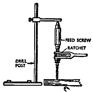 Bench drills (Fig. 12), either power or hand operated, a stronger and more rigid than the other types of drills. They should be bolted to a bench.