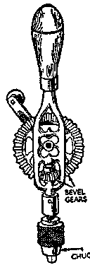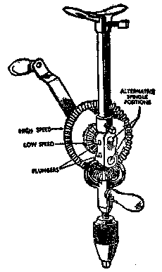 The breast drill shown in Fig. 10 is larger and more strongly made than the hand drill, and has an adjustable breastplate, by means of which a much greater pressure may be applied to the drill. The machine shown in Fig. 23 has two alternative speed ratios. These are obtained by moving the spindle of the driving wheel into one or another of the two positions as indicated in Fig. 23. In the first position the teeth around the outside of the large bevel wheel drive the small wheel attached to the chuck spindle; this gives a high speed drive. By moving the spindle, the inner set of teeth are engaged so that the chuck is rotated at a little more than the speed of the handle. It is only necessary to press a spring loaded plunger to allow the spindle to be withdrawn from either bushing. The three-jaw chuck on this type of machine generally has a capacity up to ½ inch. This drill is very well suited to the home workshop.