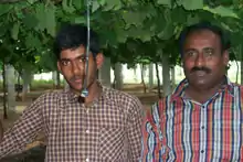 ![]() Farmer Jayashankar and his son. The hanging pipe is used to water their crop of grapes. This drip irrigation method has enabled Jayashankar's son to attend college as he is no longer needed to water the fields. Photo Credit: Anita Gursahani, USAID/India |
