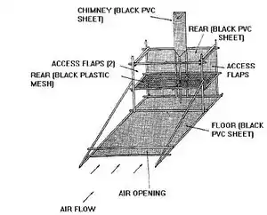 A solar dryer avoids these problems. The simplest type is the cabinet solar dryer, see Figure 1, which can be constructed out of locally available materials (eg bamboo, coir fibre or nylon weave).