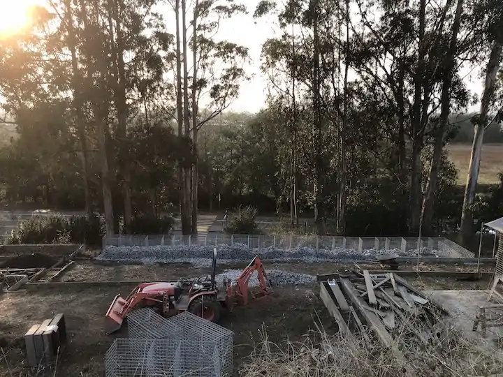 A pocket orchard learning area retained by over 70 feet of gabions, leveled with over six dumptrucks of soil, and planted with 3 of an eventual 6 fruit trees.