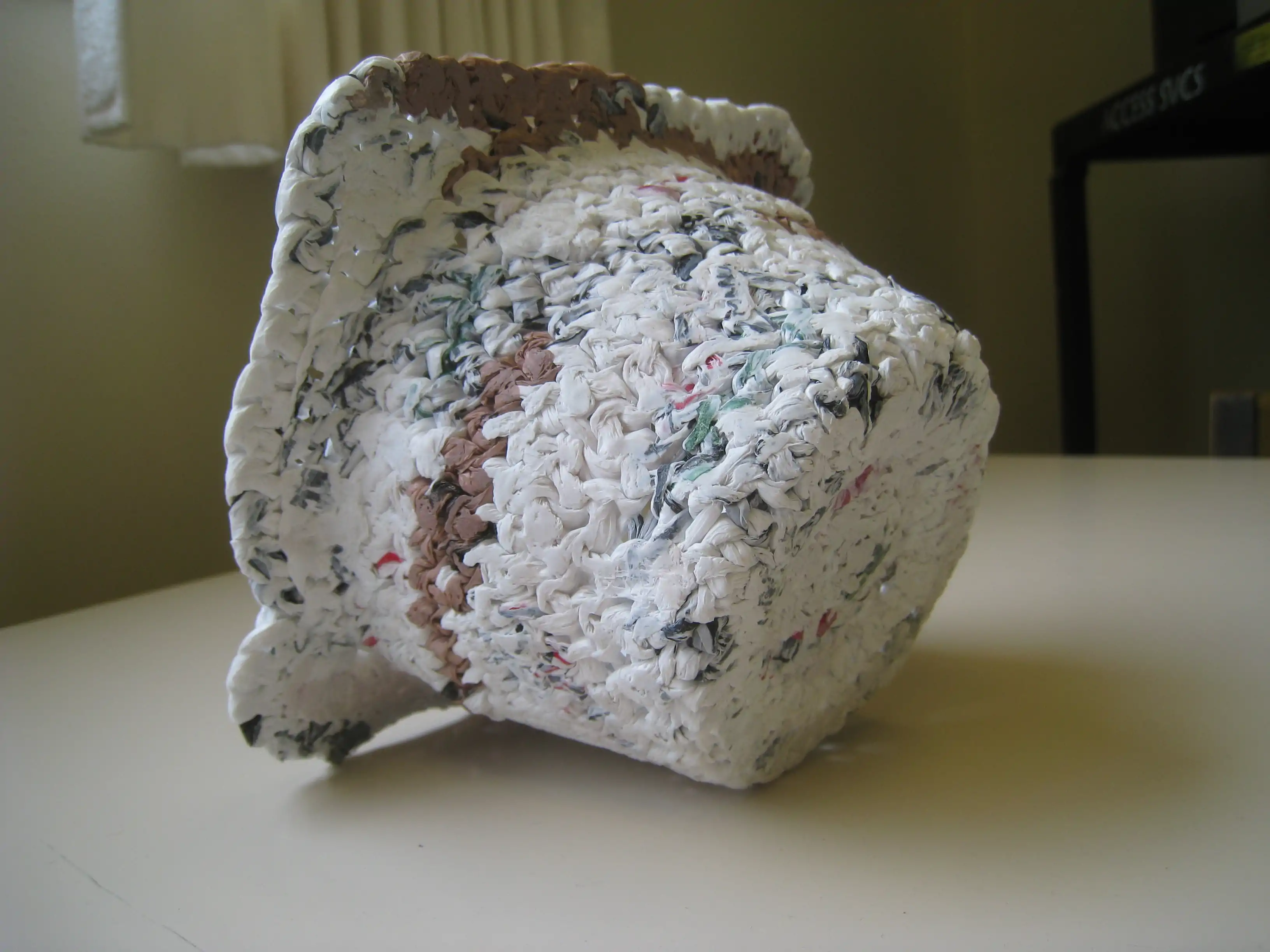 Waste plastic bags available in Haiti cleaned, cut, crocheted and ironed into a hard plastic mold