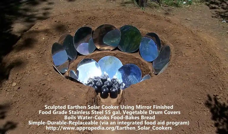 The Earthen Solar Cooker is a durable, low cost and low environmental impact design envisioned by Bart Orlando for use by the poor in refugee camps and in villages of non-industrialized nations. The design is simple; a large parabolicly shaped hole in the ground lined with reflective steel drum lids. As part of a food aid program to prevent stunting of malnourished children, pallets of 55 gallon stainless steel drums containing vegetables would be airlifted to remote refugee camps and villages. The drum lids (covers) would be specially designed to be smooth, mirror finished stainless steel surfaces which could then be used as reflectors and food serving platters. Steel drum lids are sometimes stamped with a slight parabolic curvature to strengthen them. The performance of the lids as reflectors and serving platters would also be enhanced by this parabolic shape; improving their ability to concentrate reflected sunlight and to keep food from spilling (para-bowl-la). The remaining drum cylinders could be used to store potable water or to fashion large rocket stoves . They could also be used as water heating tanks in a 30' diameter solar Earthen Solar Cooker, once blackened over a wood fire. In the evening and early morning, the reflectors could be distributed for use as personal grooming mirrors, and then collected each day by 10am and used to line the sides of the Earthen Solar Cooker. This design is intended for use in tropical regions of the Earth, where the sun rises directly overhead every sunny day.