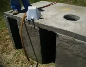 - A concrete slab the width and length of the outside dimensions of the outer walls of the combined chambers should be fashioned such that there is one hole approximately centered over each chamber. Before the slab's concrete hardens, bolts may be securely seated (or added later with a masonry drill bit and special epoxy) within the slab's top surface and just behind the hole, set apart at a width that accepts a given locale's standard size toilet seat fixtures.