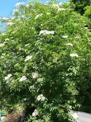 The elder flowers in clusters, in the early summer. The flowers are scented sweetly.