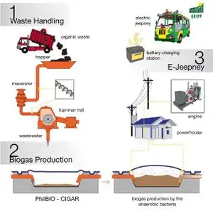The E-Jeepney’s batteries recharge using power from biodegradable waste. Many of the body parts are made locally, however the engine is imported.[4]