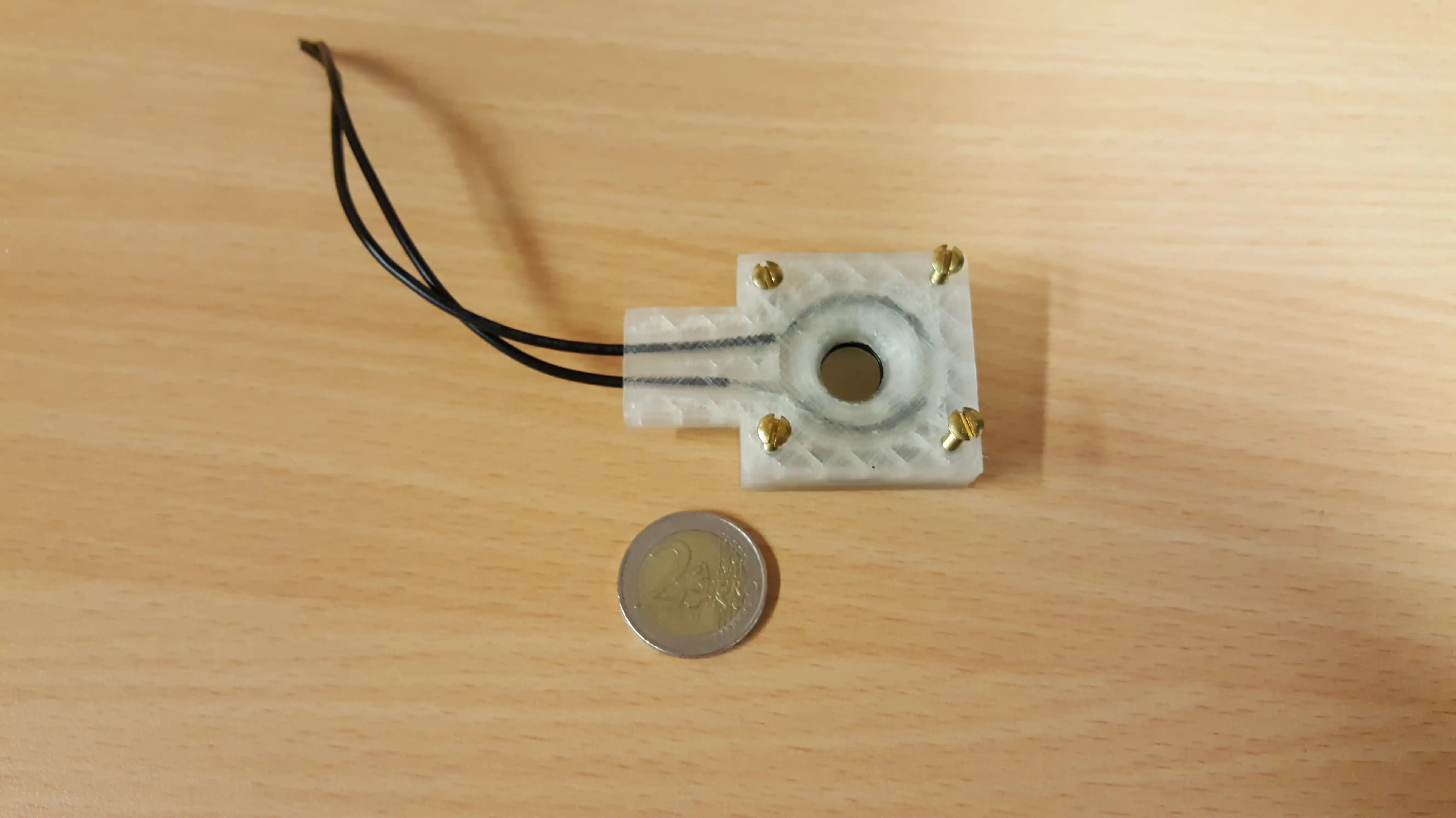 The 3D-printed parts consume ~17 g of material, which costs approximately 56 cents (750 g PLA costs ~33 € in Finland) and takes about 2 hr to print with high detail settings that were used. In addition to this 2 O-rings are required. The ones used in the design cost 2.65 € in total. In addition bolts and nuts to squeeze the top and bottom together are required that cost ~1€. Springs can be used to create contact with the sample. These can be made from ballpoint pen springs.