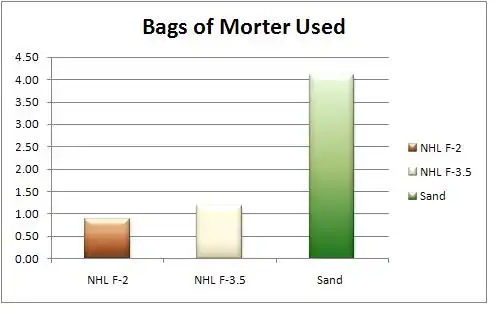 The total bags of mortar used is displayed in graph 1.4. Sand is displayed on the ration of sand and lime. For NHL-F 2, one bag of mortar would be required, rounding .88 up to 1. For NHL-F 3.5, Two bags of mortar would be required for the total surface area, rounding 1.17 up to 2.(Rounding up is done to find the total number of whole bags needed, assuming you can't buy part of a bag.) The total sand needed for the sand to lime ratio is 5 bags, again rounding up from 4.10. Calculations are shown in excel spreadsheet and graph 1.4 shows the data.
