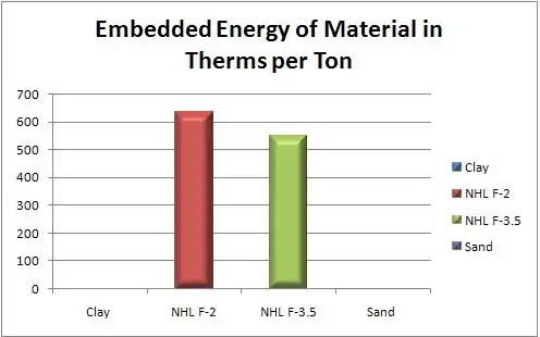 Graph 1.2 shows the total embedded energy in each material. Again clay continues to be the lowest material, accounting only for energy required for manual labor in application. The graph also shows that the material requiring the most embedded energy is NHL F-3.5 with 634 therms per a ton of material. According to the graph, NHL F-2 required 550 therms per a ton of material and Sand required a mere .04 therms per a ton of material.