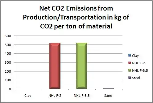 The graph 1.3 shows the net CO2 emissions for the total production and transportation of each material. This graph shows that NHL F-3.5 produces the most CO2 during total production and transportation to Humboldt County stores, producing 520.25 kg of CO2 per a ton of material. This is in comparison to NHL F-2, which produces 517 kg of CO2 per a ton of material, and Sand which produces a mere 5.58 kg of CO2 per a ton of material (Graph 1.3). Clay continues to be the lowest with 0 kg of CO2 per a ton of material assuming CCAT uses it’s own clay.