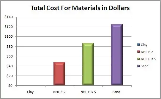 Based on our results, the most costly material is the sand. Graph 1.1 shows that the total price for this material is $125 for the surface coverage of 320 ft^2, compared to the prices of NHL F-2 ($47.28),NHL F-3.5 ($86.26)and clay, which is free. This material will be added to the lime.