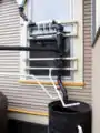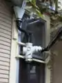 A different style of roof washer. This summer we installed a commercially available roof washer that uses a programmable valve to divert a rain's first flow away from the cistern. A purported advantage is the absence of standing water that can stagnate and potentially contaminate the cistern water. (This could happen, for example, if the trickle valve on the conventional device were to clog or it were left closed.) Below are two photos of the system with this new device. The first photo shows the roof washer mounted on a window frame near the cistern. Rainwater, which enters from the two downspouts above, can be observed from inside the dwelling. The first flush is diverted downwards into a holding barrel. An overflow hose from the top of the cistern also empties into this barrel. Post-flush water enters the cistern via the roof washer's side port through a screened cistern entry hole. The barrel overflow is directed to a swale in the middle of our back yard.