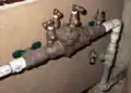 - A reduced pressure backflow prevention device. This was required by the city to prevent flow of rainwater into the public system. Cost: $120. This would not be necessary if we used rainwater exclusively. However, Oregon has very dry summers and our cistern is exhausted by July. We currently depend on city water during the summer. The city requires annual inspection of these devices, costing about $30. (See photo below.)
