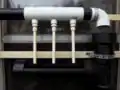 At the same time I installed this roof washer I also installed a more elaborate piping configuration (see photo, above, left) leading from the downspouts to the cistern that is intended to act as a water sculpture. Viewable from our dining room window, it will display ten areas of flowing water, depending on the time in a rainwater event and the rainwater flow. During a typical Oregon drizzle, only the left most vertical pipe (see photo, above right) carries water. During a downpour all three pipes will be filled to capacity and additional flow will emerge from the 2" elbow.