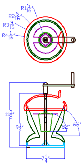 The final design solution, Nutsy: The Acorn-Shaped Nut Sheller Funding and Promoting the Full Belly Project, is modeled after the shape of an acorn. Externally Nutsy has a textured top, which mimics that of an acorn, with an upside-down cone-shaped midsection and a hemispherical base. Internally the sheller mimics the design of the UNS, but it is rotated 180 degrees to fit within the external acorn shape. Autocad software was used to create drawings of a workable model shown in Figure 1.